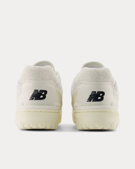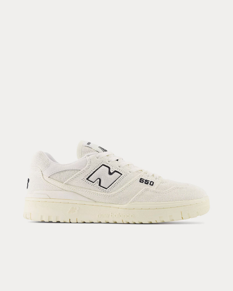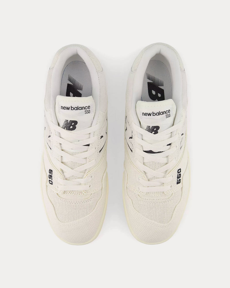 New Balance 550 low top sneakers in sea salt with black are based on classic '80s basketball sneakers and feature premium all-over canvas upper with hits of suede, a streamlined silhouette, classic leather uppers rubber outsole for traction and durability, and adjustable lace closures.