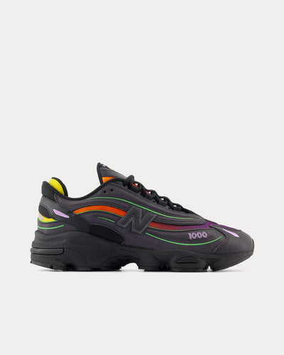 The unisex New Balance 1000 low top sneakers in black with honeycomb feature mesh underlays, synthetic overlays, combination polyurethane and ABZORB midsole, with ABZORB cushioning at heel and forefoot, stability web, sculpted midsole details, embroidered details, reflective accents, and rubberized ‘N’ logo with transparent outline.