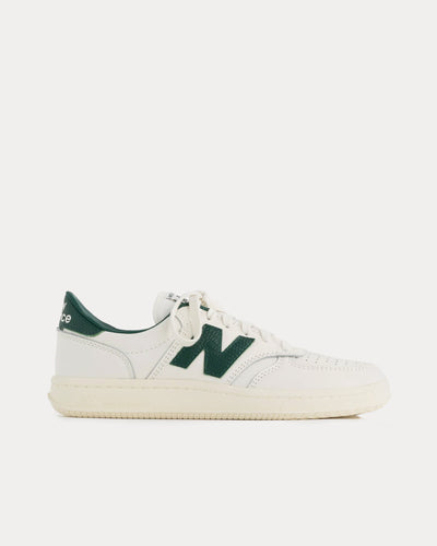 The unisex New Balance x Aime Leon Dore T500 Tennis Oxford low top sneakers in white with green feature premium leather overlays & underlays, synthetic leather collar lining, rubber outsoles, rubber cupsoles, Aimé Leon Dore branded tongue, co-branded heel tab, and embossed snakeskin pattern leather N logo & heel tab.