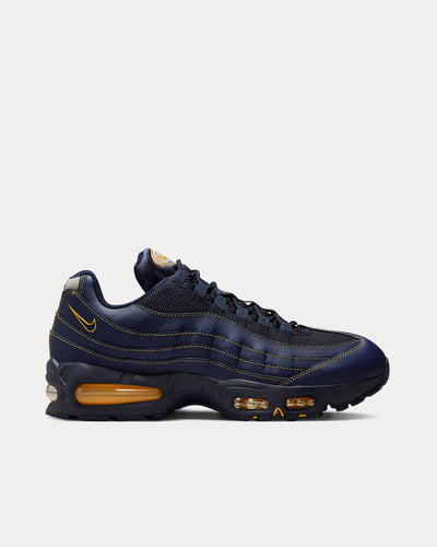 The men's Nike Air Max 95 OG low top sneakers in Obsidian, Varsity Maize, Wolf Grey, and Obsidian channel iconic '90s athletic style with a bold silhouette. The signature wavy side panels evoke muscular movement, while layered materials and anatomical references bring depth and structure to the design.
