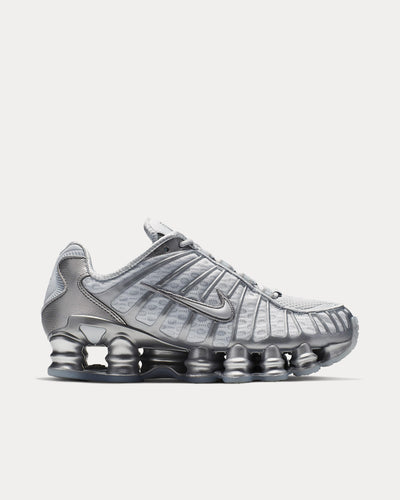 The women's Nike Shox TL low top sneakers in pure platinum and chrome feature suede and leather uppers, Shox technology, foam midsoles, and rubber outsoles.