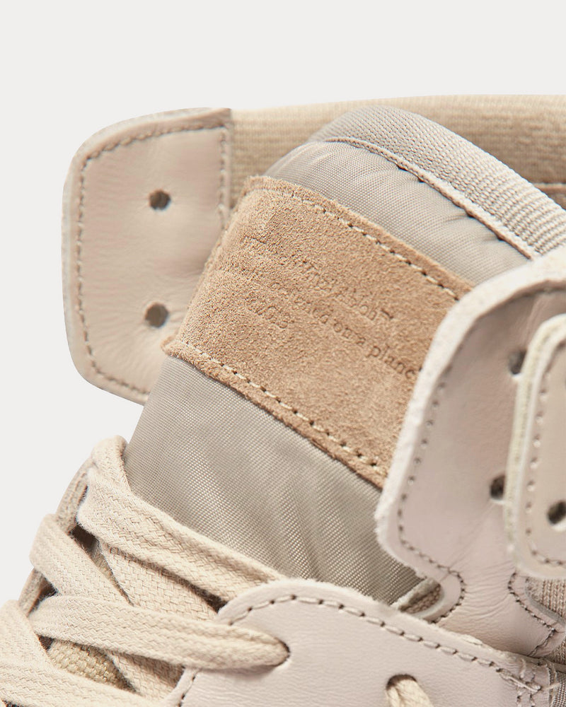 The Off-White Vulcanized Leather High Top Sneakers in beige featuring an arrow patch on the side. Beige diagonals rubber sole with "OFF" text print. Leather uppers. Suede panelling. Rubber outsole.