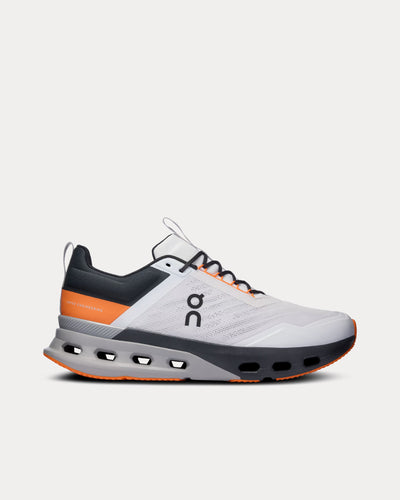 The men's On Running Cloudnova X running shoes in frost and orange are designed for versatile gym workout and feature Updated tread pattern for grip during side-to-side movements X-shaped Speedboard® for greater forefoot flexibility, full-length CloudTec® cushioning for a smoother ride, dual-density Helion™ superfoam for comfort and stability, uppers made with soft spacer mesh for maximum breathability, Smooth materials provide a plush feel and soft step-in quick-collapsing Cloud elements in the heel for stability, and a for street-ready style packed with gym-ready tech.