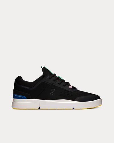 The men's On Running The Roger Spin low top sneakers in black and indigo are inspired by pro-performance tennis sneakers and and feature a hidden cage for extra forefoot support with extra cushioning and flexibility, a pared-down aesthetic design, and made from more than 25% recycled content, including 95% recycled polyester.