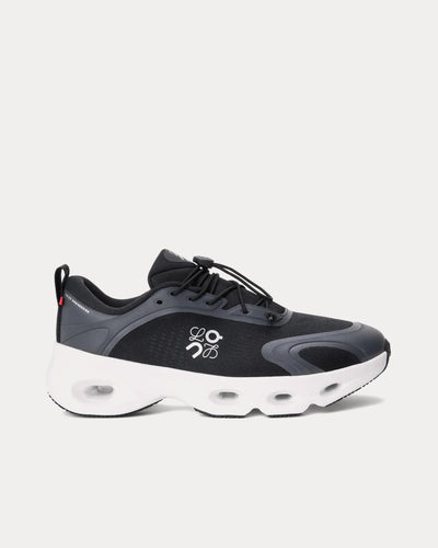 The women’s On x Loewe Cloudsolo sneakers in Black and White represent the first sneaker co-designed by both brands, fusing On’s cutting-edge Swiss engineering with Loewe’s artisanal design codes. The upper is crafted from On’s technical mesh featuring semi-translucent yarns and accented with Loewe’s signature “pebble” motif toggle for distinctive branding. Elastic speed laces and co-branded logos enhance both fit and style.