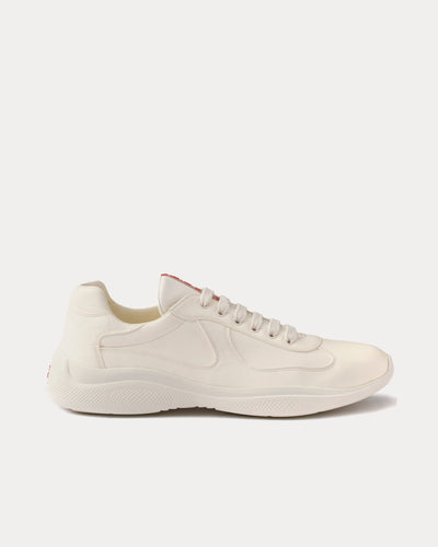 The men’s Prada America’s Cup Nappa Leather sneakers in Ivory carry forward the legacy of Prada's 1990s sailing-inspired design made for the Luna Rossa crew. Crafted from soft yet durable nappa leather paired with breathable bike fabric, this lace-up style merges performance with sophisticated aesthetics. The sneakers feature enameled metal eyelets and cotton laces, with the signature Prada Linea Rossa label on the tongue for authentic branding.