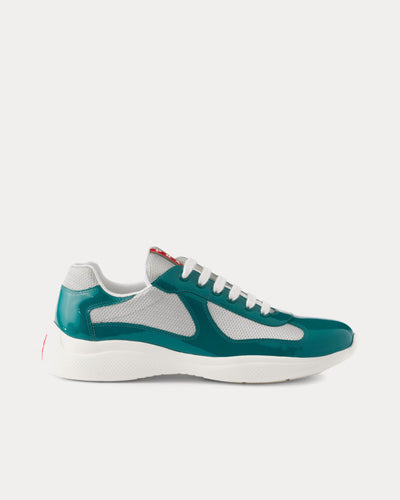 The men's Prada America's Cup low top sneakers in lagoon blue and silver are from the Prada Linea Rossa line feature patent leather and fabric uppers, Prada Linea Rossa logo on the tongue and sole, 40 mm light, flexible rubber sole and a rubber tread. Made in Italy.