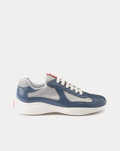 The men's Prada America's Cup Patent Leather & Technical Fabric sneakers in Marina Blue and Silver bring a luxurious update to an iconic silhouette. Designed with a sleek, high-shine patent leather upper, complemented by breathable technical fabric inserts, these sneakers balance sport-inspired functionality with refined elegance.