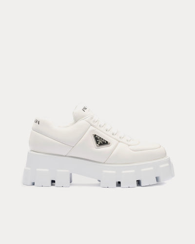 The women's Prada Soft Padded Nappa Leather low top sneakers feature enameled metal triangle logo, 55 mm rubber sole, chunky lug sole, and removable leather-covered insole. Made in Italy.