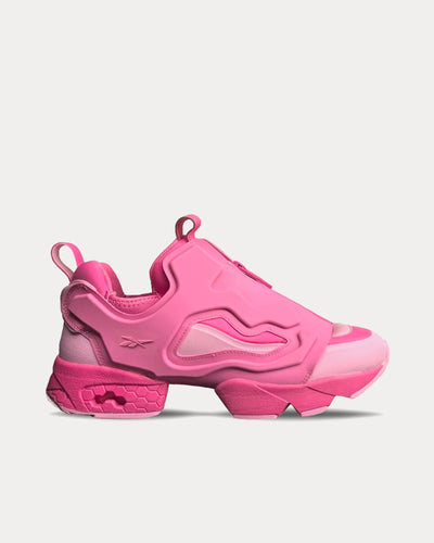 The sneaker features a vibrant bubblegum pink colorway with lighter pink accents on the mudguard, heels, and outsole. More than just a color update, the silhouette has been re-engineered with a sleek zippered overlay, replacing the traditional pump button and inflatable bladder for a more streamlined and utilitarian look.