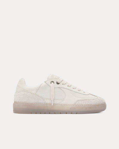 The men's Represent Virtus low top sneakers in vintage white are crafted from nylon & leather and feature luxury tri-leather composition uppers with a mix of flat leather, tumbled leather and hairy suede panels, repeat R Initial debossed trims throughout the shoe, an Initial debossed logo to the back and Represent logo to the tongue, and tonal semi translucent low profile outsole.