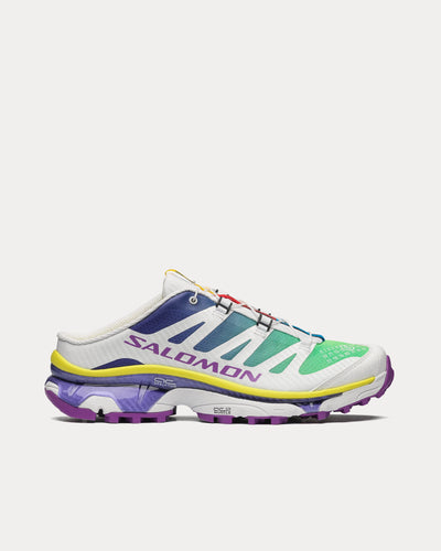 The unisex MM6 Maison Margiela x Salomon XT-4 mules in spectrum blue, white, and spring bouquet feature a stable Agile Chassis Skeleton, slip on mule design, toggle fastening, and a comfortable dual-density midsole.