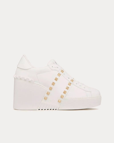 The women's Valentino GaravaniOpen Disco Wedge low top sneakers in white calfskin leather feature a band with platinum-finish studs, special label with number 11, and rubber soles with rubber stud detail on the back. Made in Italy.
