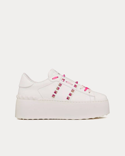 The women's Valentino Garavani Rockstud Untitled Flatform low top sneakers in white and pink PP are crafted from calfskin leather and feature band with multicoloured stud appliqués,