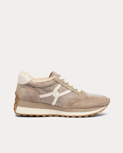 The women's Veronica Beard Valentina Suede & Shearling sneakers in Cobblestone Grey blend casual elegance with cozy winter-ready details. Crafted from smooth leather with suede trims and lined with soft shearling, these low-top sneakers feature the signature interlocking-V design synonymous with the brand.