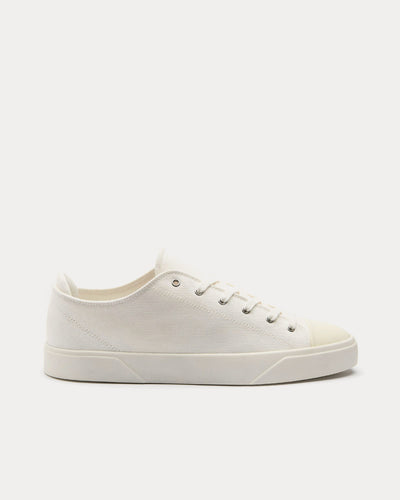 The unisex Vor 1E Leinweiss low top sneakers in off-white are crafted from organic cotton canvas ith a smooth leather lined insole and a rubberized toe cap and feature abrasion-resistant TPU outsole 2, silver eyelets, and special memory foam insole for durable comfort. Made in Portugal.